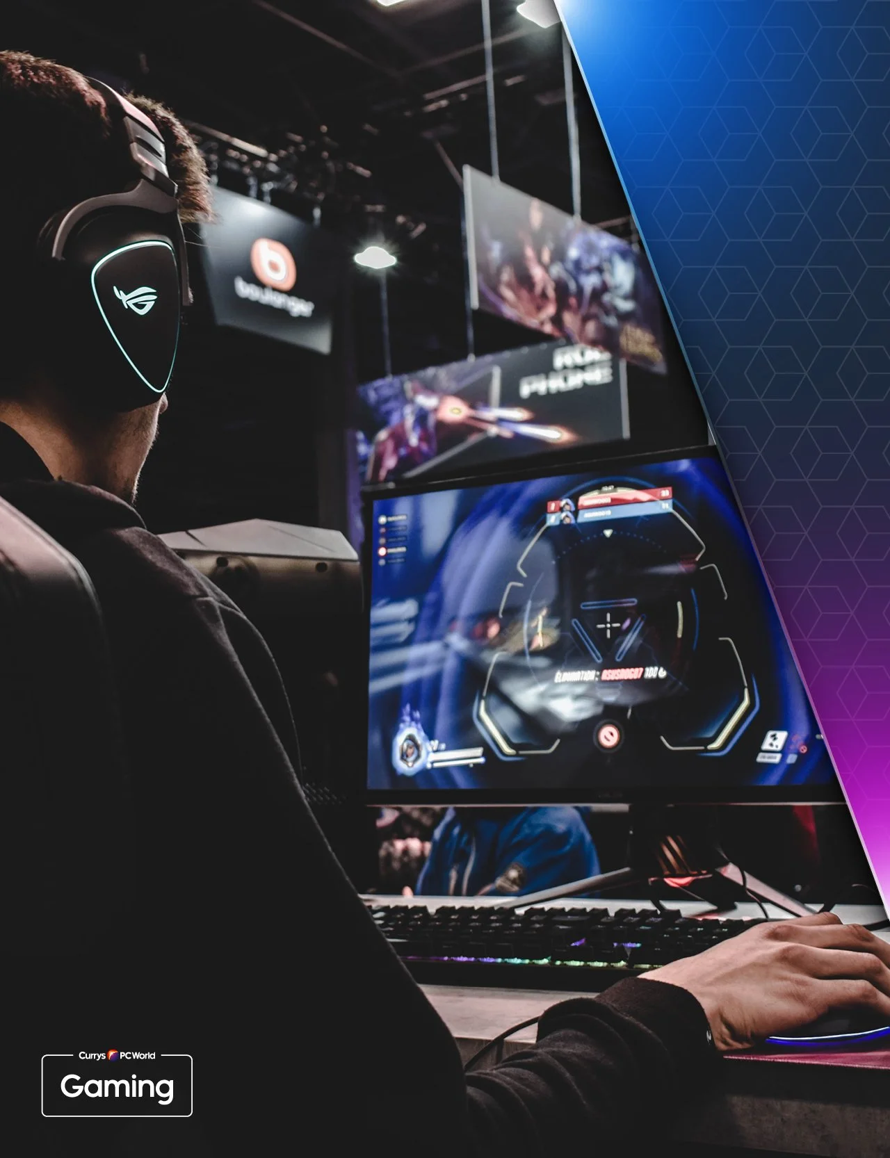 The gaming world is deeply immersive, with audiences ranging from casual players to hardcore enthusiasts with high-end setups. For Currys PC World (before rebrand), I developed an identity that connected with this spectrum—positioning the brand as a go-to for cutting-edge gaming tech. The visual language drew from the gaming scene’s dark aesthetic, using neon accents, angular textures, and RGB-inspired lighting to reflect the environment.